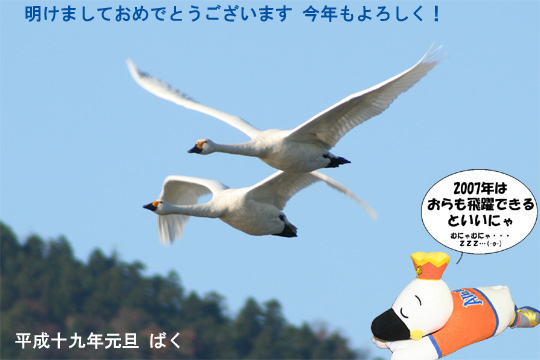 1枚目は2006年11月に新潟市西部の上堰潟公園にて撮影したハクチョウです.日中は沼地から飛び立って,エサを食べに近くの田んぼまで通勤しています.その出勤風景です:-) サッカーJリーグのアルビレックス新潟のクラブマスコットであるアルビくんも,同じくハクチョウなので入れてみました.なんだか寝言を言ってますね.アルビが勝ってる夢でも見てるんでしょうか:-)